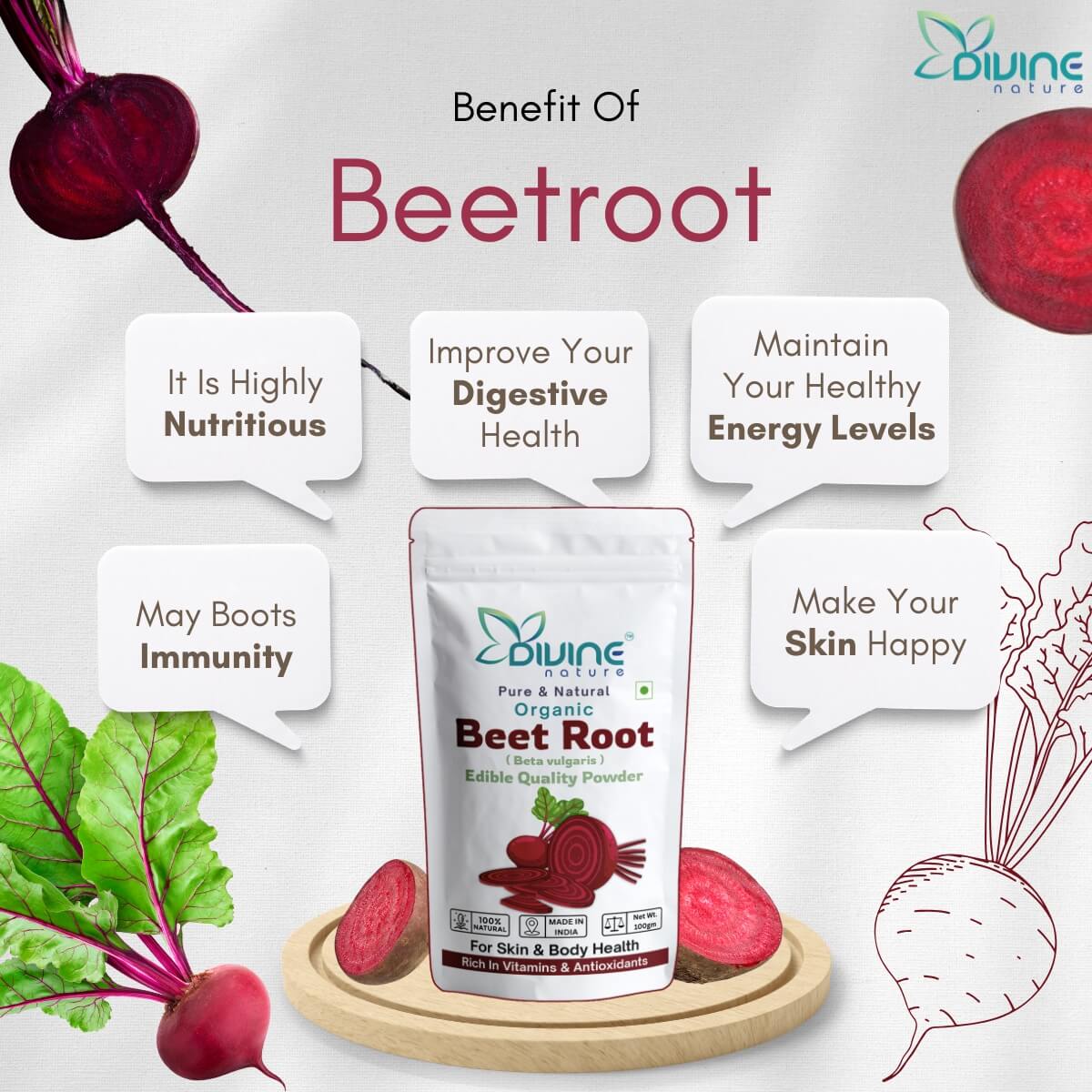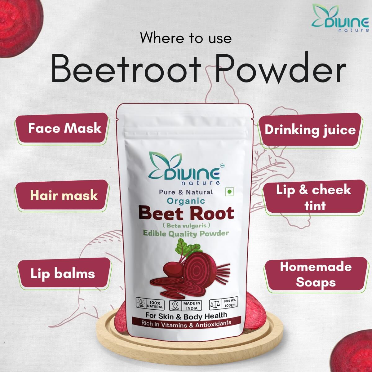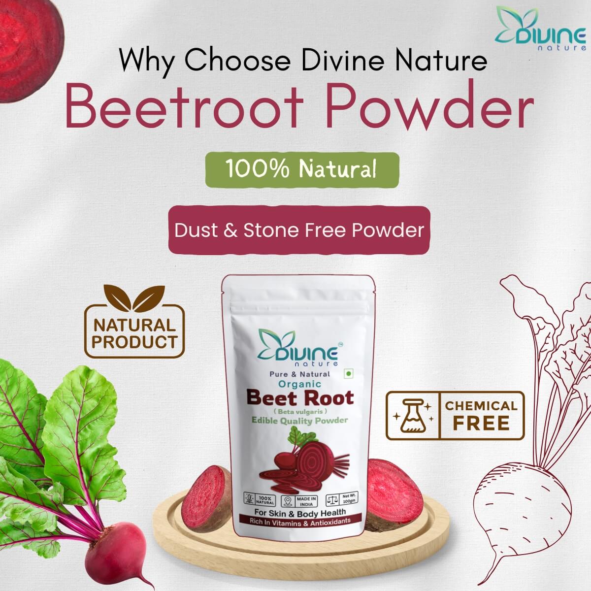Divine Nature Pure and Natural Beetroot Powder for Face Pack Lips, Skin & Hair | Beetroot Powder For Drinking | Glowing Skin